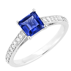 Bague Or blanc 18 carats - Saphir bleu Princesse 1 carat - Sertissage Diamant