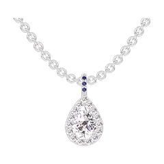 Pendentif Or blanc 9 carats - Diamant Poire 0.3 carat - Halo Diamant - Sertissage Saphir bleu - Chaîne Forçat