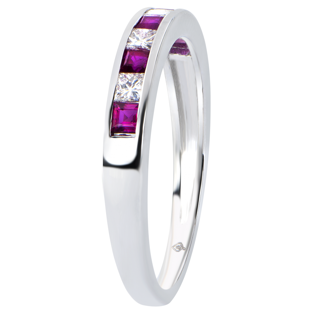 Un anneau or blanc semi pavé saphir rose et diamants. Un bijou classique et intemporel et une note colorée. 4 diamants : 0.23 carat - Or blanc (18 carats = 750/-): 2.4 g. Diamant : 4 - Saphir rose : 5 - Total: 0.39 carat Plus dimensions