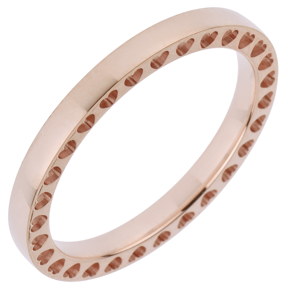 une alliance en or rose avec un motif de coeur découpé à l'infini dans sa tranche.