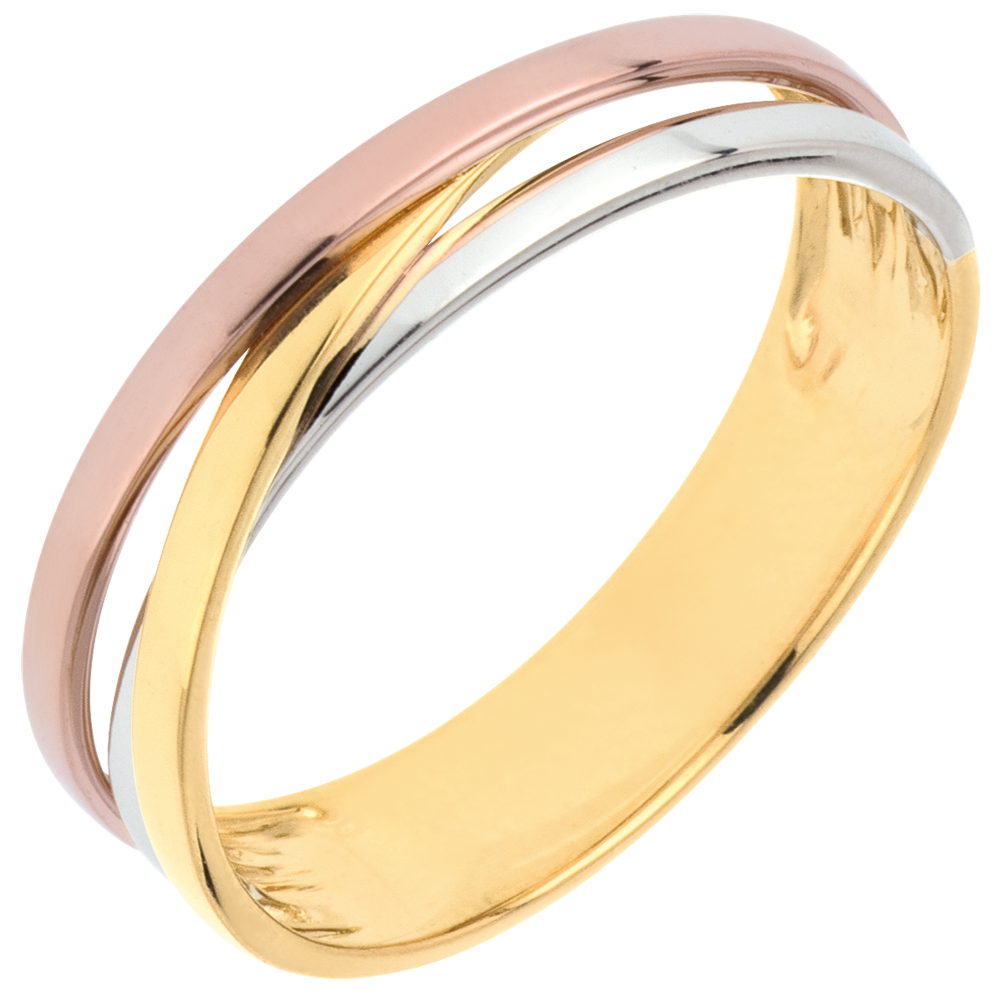 Une trilogie d'anneaux enlacés pour une alliance tout en mouvement et finesse. Cette alliance trois ors peut convenir à une femme et à un homme du fait de sa largeur de 4mm. Une alliance idéale pour célébrer votre union de mariage ou votre engagement. Trois ors (18 carats = 750/-): 2.3 g. Plus dimensions