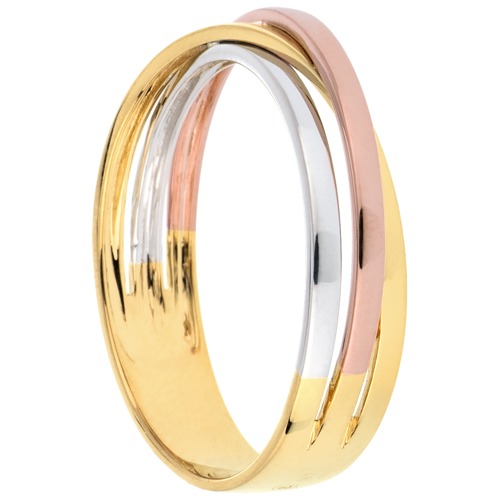 Une trilogie d'anneaux trois ors enlacés pour une alliance de mariage tout en mouvement et finesse. Cette alliance trois ors peut convenir à une femme et à un homme du fait de sa largeur de 4mm. Une alliance idéale pour célébrer votre union de mariage ou votre engagement. Trois ors (9 carats = 375/1000): 1.7 g. Plus dimensions