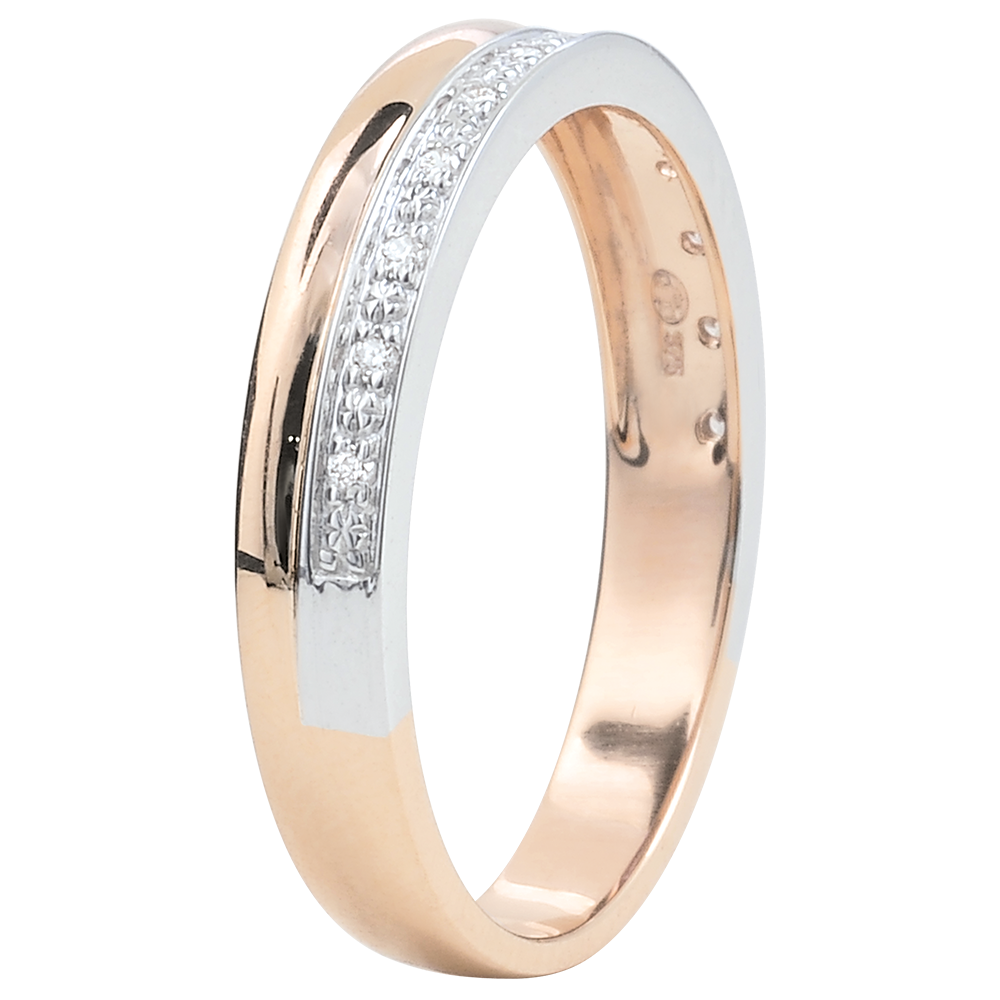 Une bande d'or rose se marie à une bande d'or blanc sertie de diamants. Une alliance de mariage pour femme délicate et élégante.