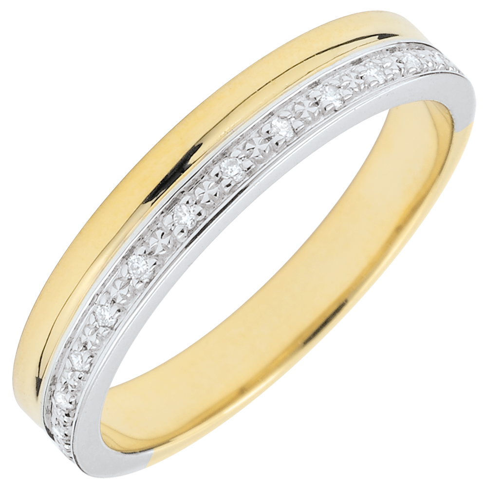 Une bande d'or jaune se marie à une bande d'or blanc sertie de diamants. Une alliance de mariage pour femme délicate et élégante.