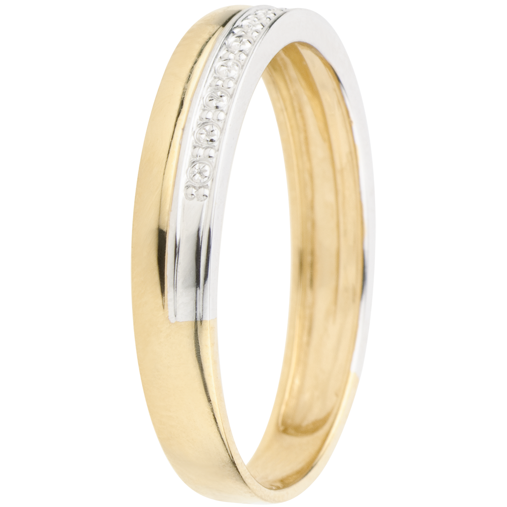 Une bande d'or jaune se marie à une bande d'or blanc travaillée façon diamant pour l'élégance et l'intemporalité.
