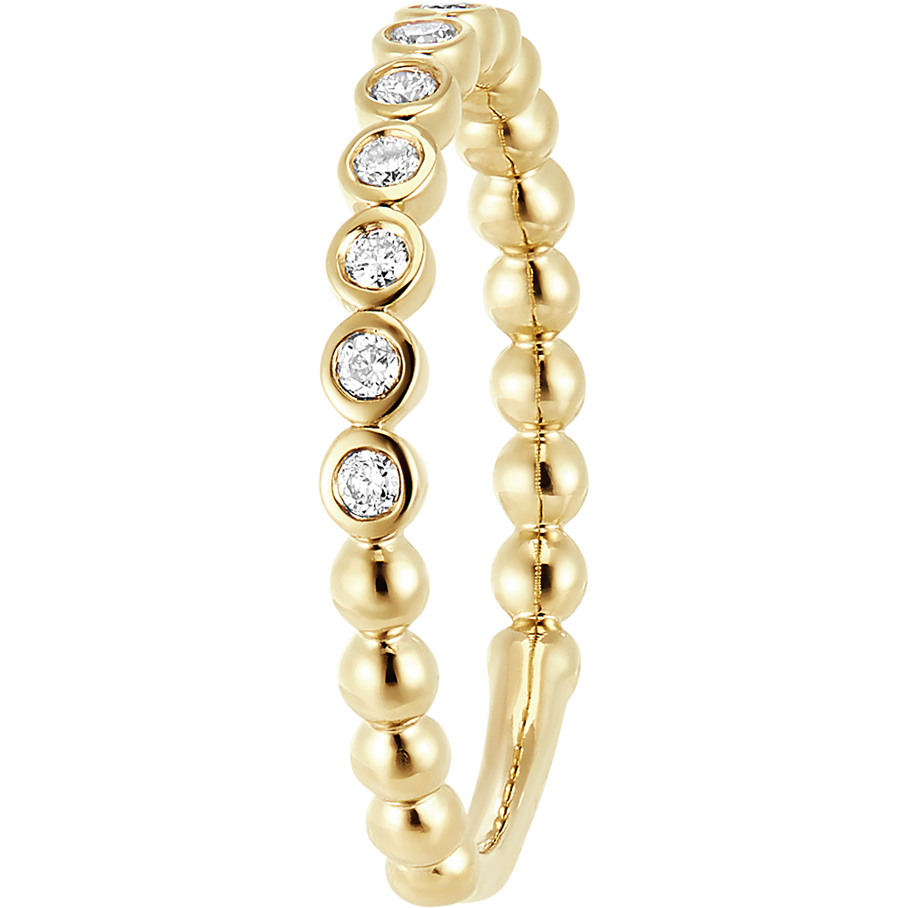 Une alliance perlée d'un pavage de 11 diamants sertis clos. Un scintillement inégalé, inspiré de cette lumière délicate que reflète les gouttes de la rosée matinale. 11 diamants : 0.15 carat - Or jaune (9 carats = 375/1000): 1.2 g. Plus dimensions