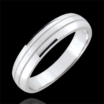 Une alliance de mariage moderne, discrète et masculine dont l'or blanc brossé au centre apporte une touche d'originalité.
