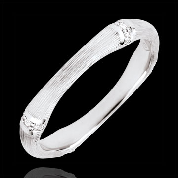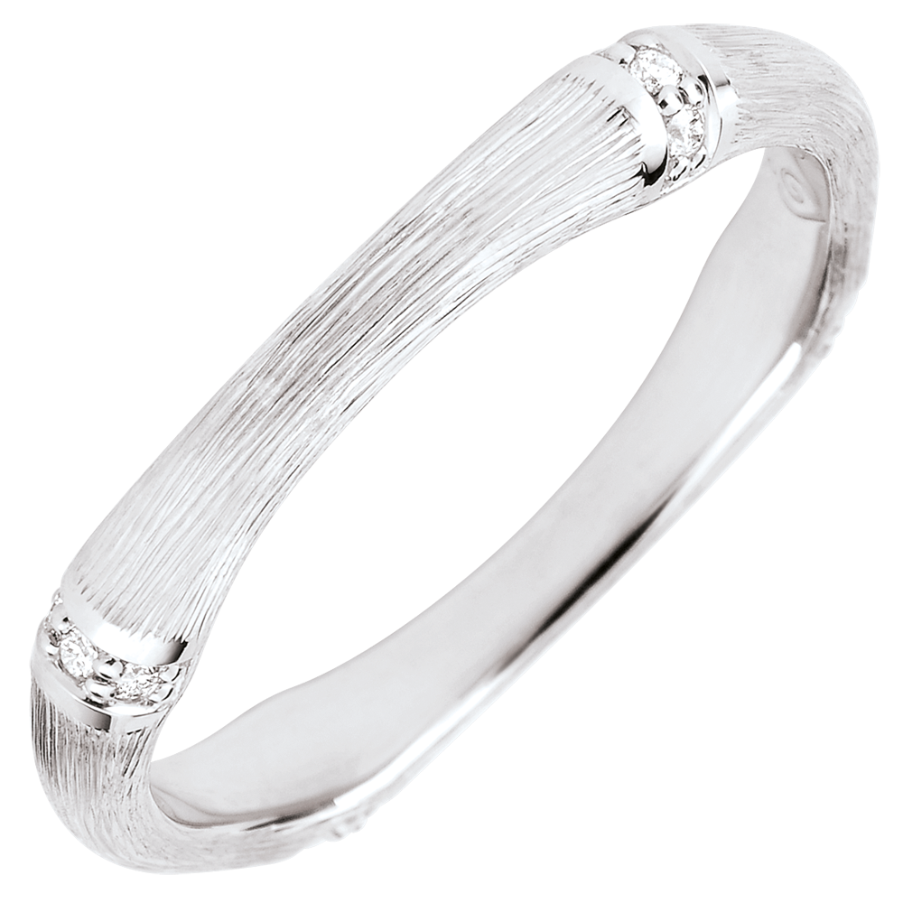 Une branche de bambou souple et solide se métamorphose en un anneau d'or blanc brossé éternel, serti de diamants. Le travail à la main de la finition matte lui confère un aspect naturel au réalisme saisissant. 12 diamants : 0.06 carat - Or blanc (18 carats = 750/-): 3 g.Plus dimensions