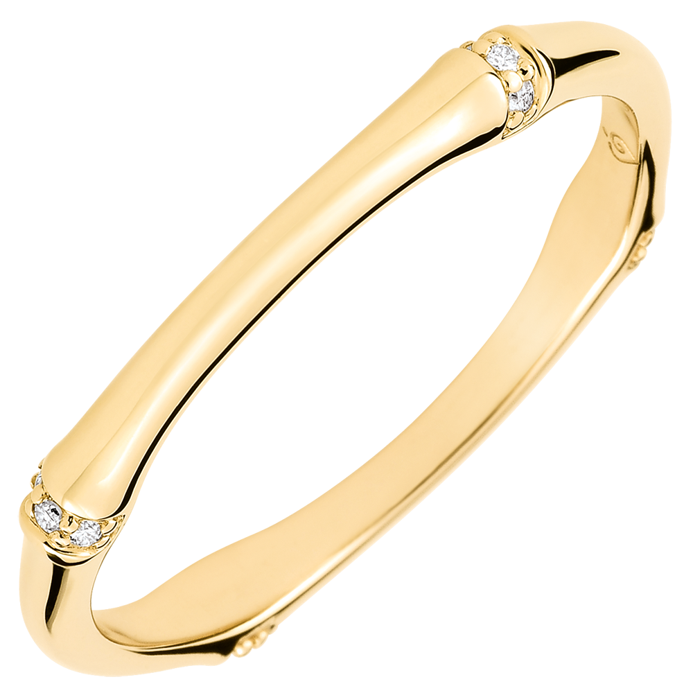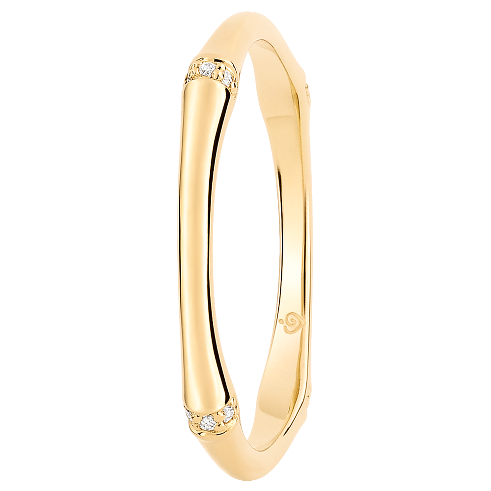 Une branche de bambou souple et solide se métamorphose en un anneau d'or jaune 18 carats, symbole d’éternité et de nature. Ce bijou délicat est serti de 12 diamants brillants totalisant 0,036 carat, offrant un éclat subtil et raffiné. Son design créatif évoque la force et la flexibilité du bambou, parfait pour célébrer un engagement unique.… Voir plus Infos techniques
