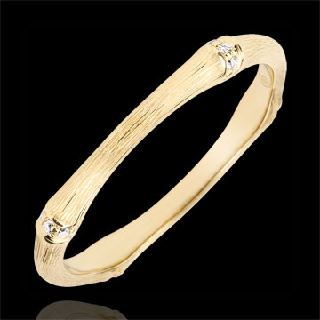 Une branche de bambou souple et solide se métamorphose en un anneau d'or jaune brossé éternel, serti de diamants. Le travail à la main de la finition matte lui confère un aspect naturel au réalisme saisissant.