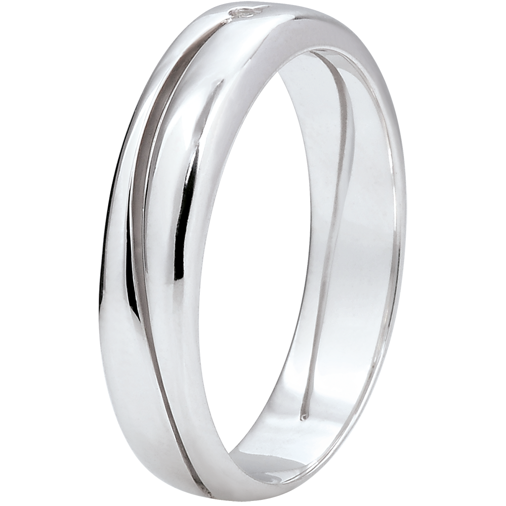 Un large anneau d'or blanc est traversé par une vague qui l'aère en 2 parties. En son centre trône un diamant. Alliance homme et femme.
