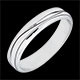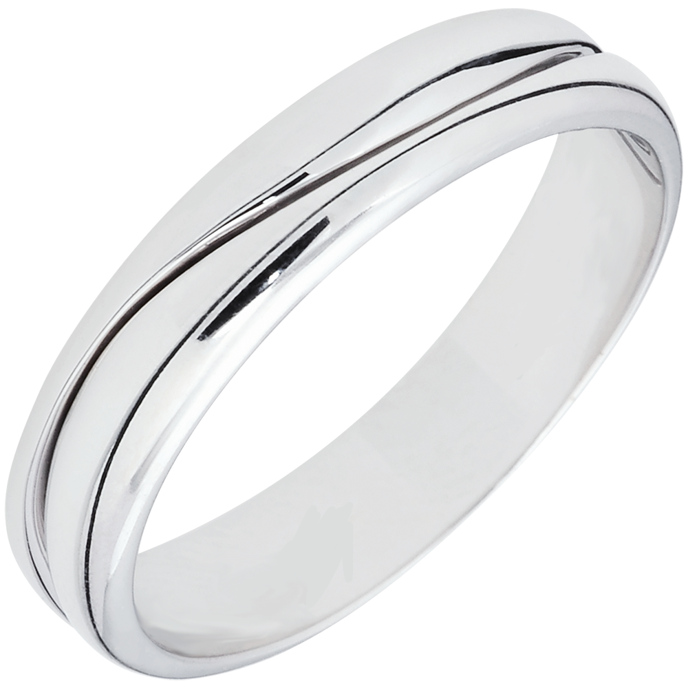 Un large anneau d'or blanc est traversé par une vague qui l'aère en 2 parties. Alliance unisexe homme et femme.