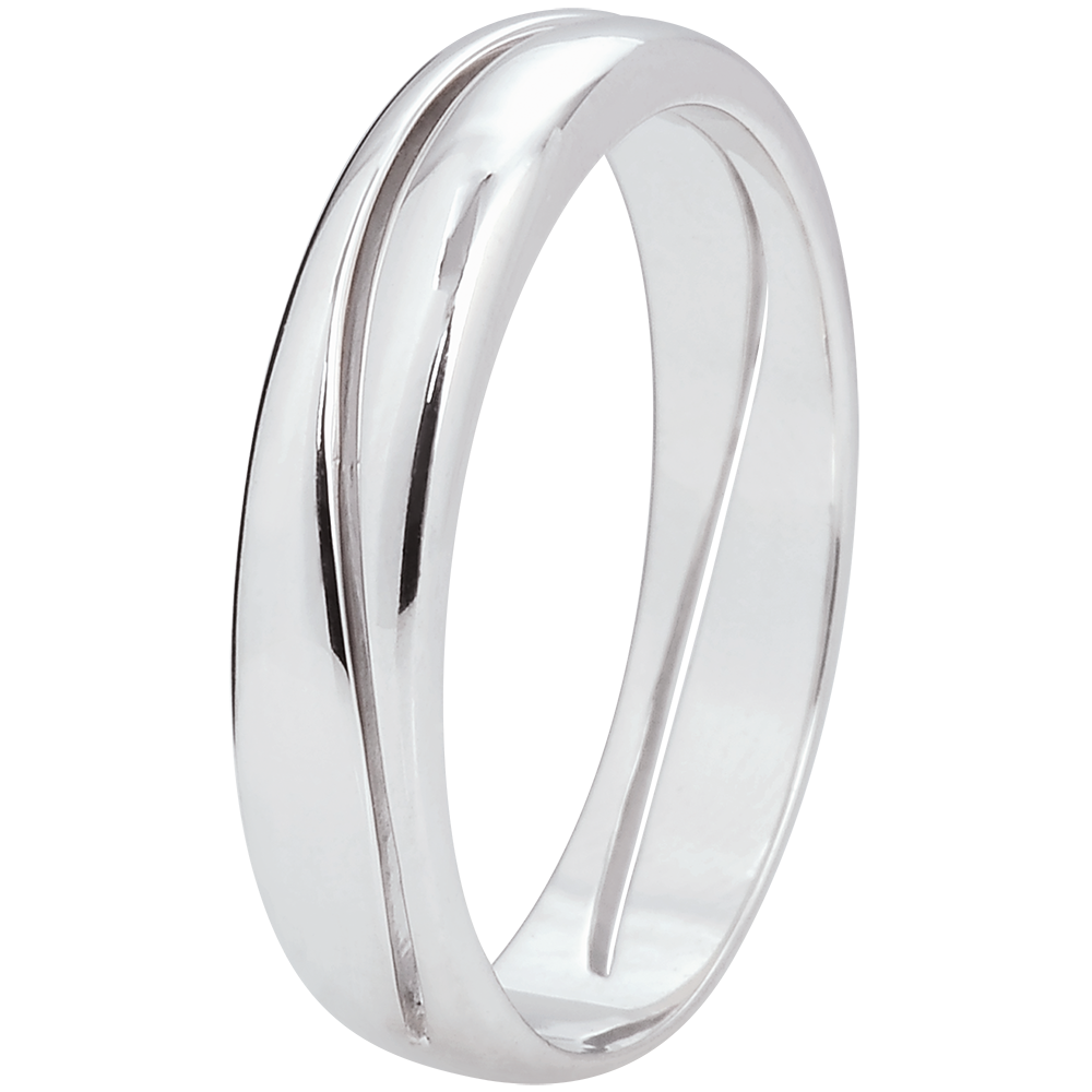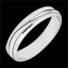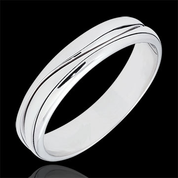 Un large anneau d'or blanc est traversé par une vague qui l'aère en 2 parties. Alliance pour homme et pour femme.