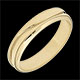 Un large anneau d'or jaune est traversé par une vague qui l'aère en 2 parties. Alliance pour homme et pour femme.