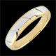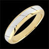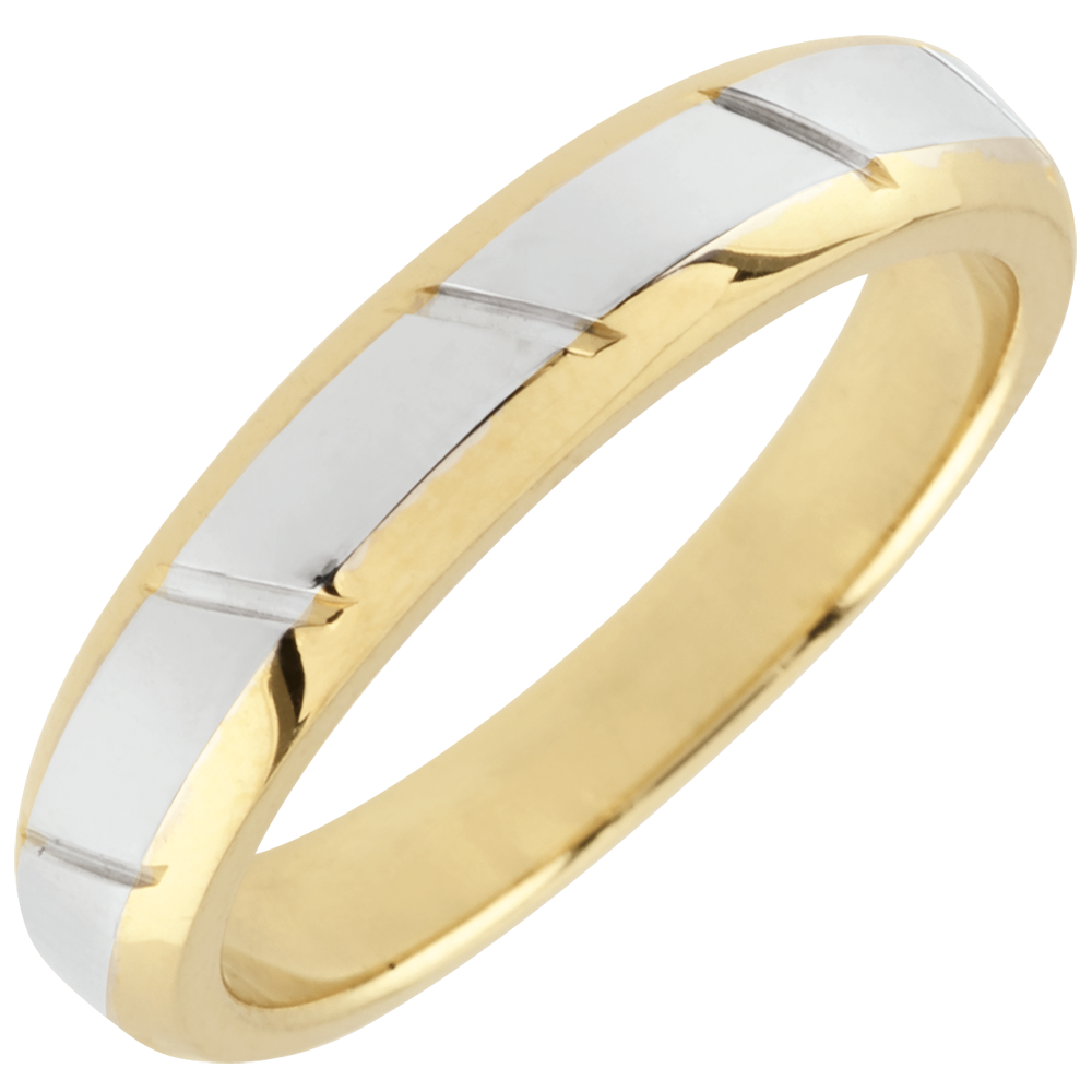 Un anneau or blanc en volume aux bords biseautés est marqué par des striures.