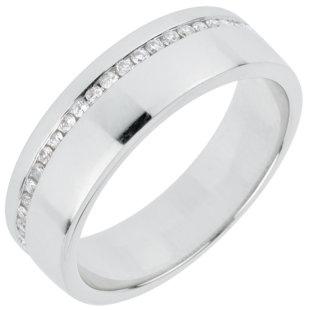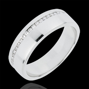 un large anneau d'or blanc est traversé par une ligne de diamants taille brillant.