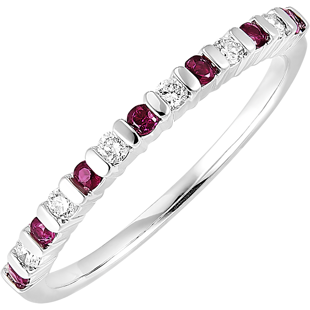 Un anneau or blanc serti barettes avec alternance de rubis et diamants. Un bijou classique et intemporel à la fois pour une note colorée. 6 diamants : 0.1 carat - Or blanc (9 carats = 375/1000): 1.5 g. Rubis : 7 - Total: 0.11 carat Plus dimensions