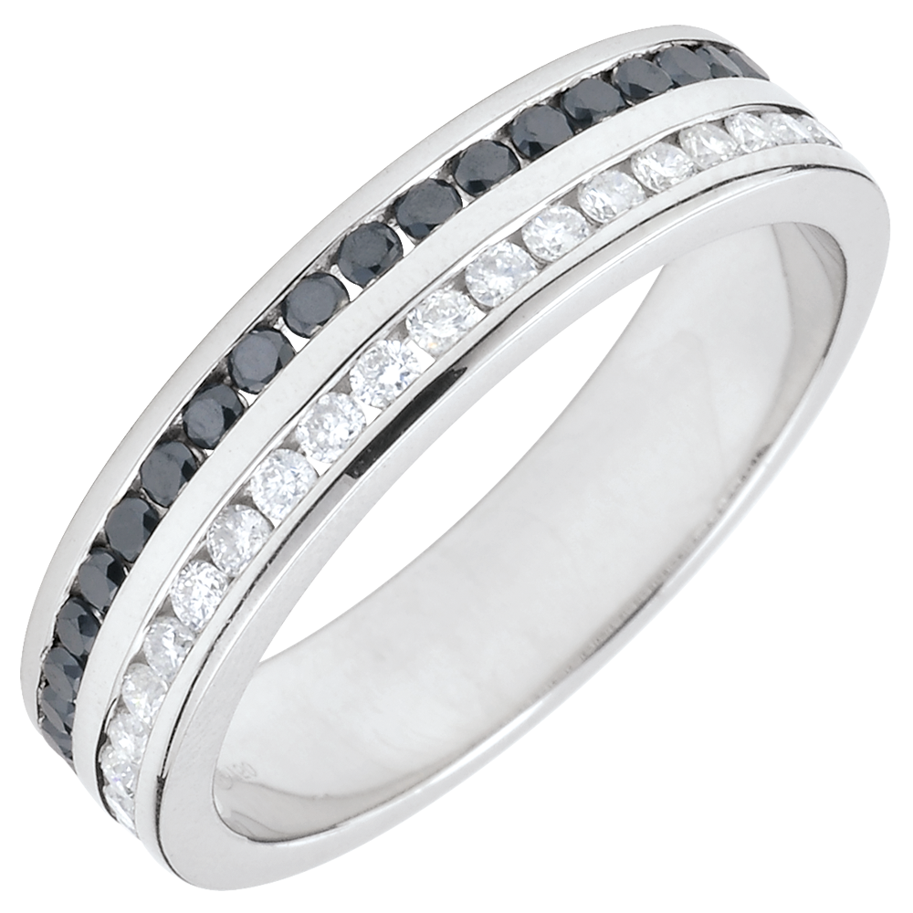 L'équilibre parfait d'un anneau en or blanc avec un rang de diamants blancs et un rang de diamants noirs ronds sertis rail, pour une symbolique forte. Un bijou incontournable pour un lien d'exception. 21 diamants : 0.19 carat - Or blanc (18 carats = 750/-): 3.9 g. Diamant : 21 - Diamant noir - Total: 0.19 carat Plus dimensions