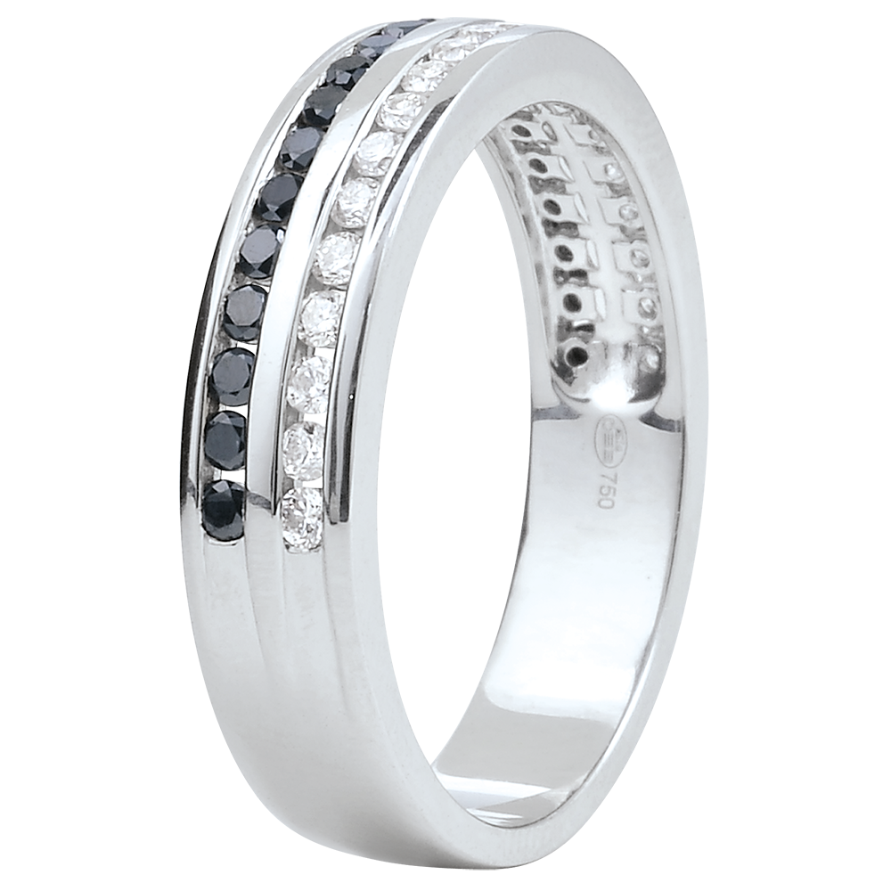 L'équilibre parfait d'un anneau en or blanc avec un rang de diamants blancs et un rang de diamants noirs ronds sertis rail, pour une symbolique forte. Un bijou incontournable pour un lien d'exception. 21 diamants : 0.19 carat - Or blanc (9 carats = 375/1000): 3.3 g. Diamant : 21 - Diamant noir - Total: 0.19 carat Plus dimensions