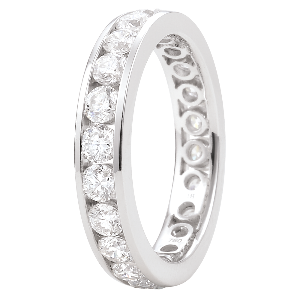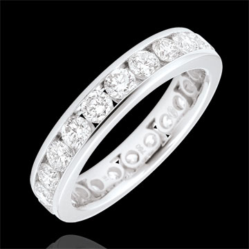 L'équilibre parfait d'un anneau or blanc pavé de 23 diamants ronds sertis rail, pour une symbolique forte. Un bijou incontournable pour un lien d'exception.