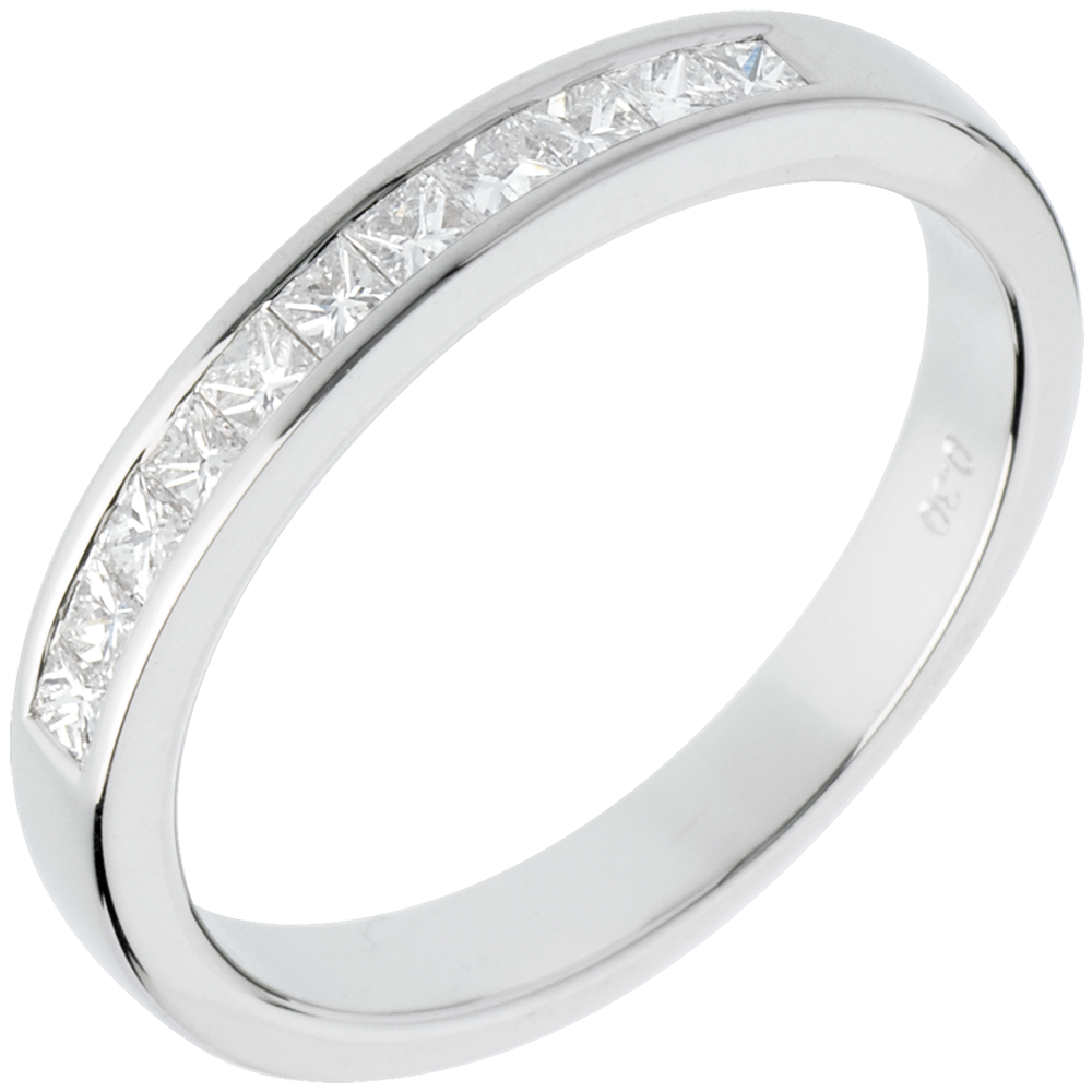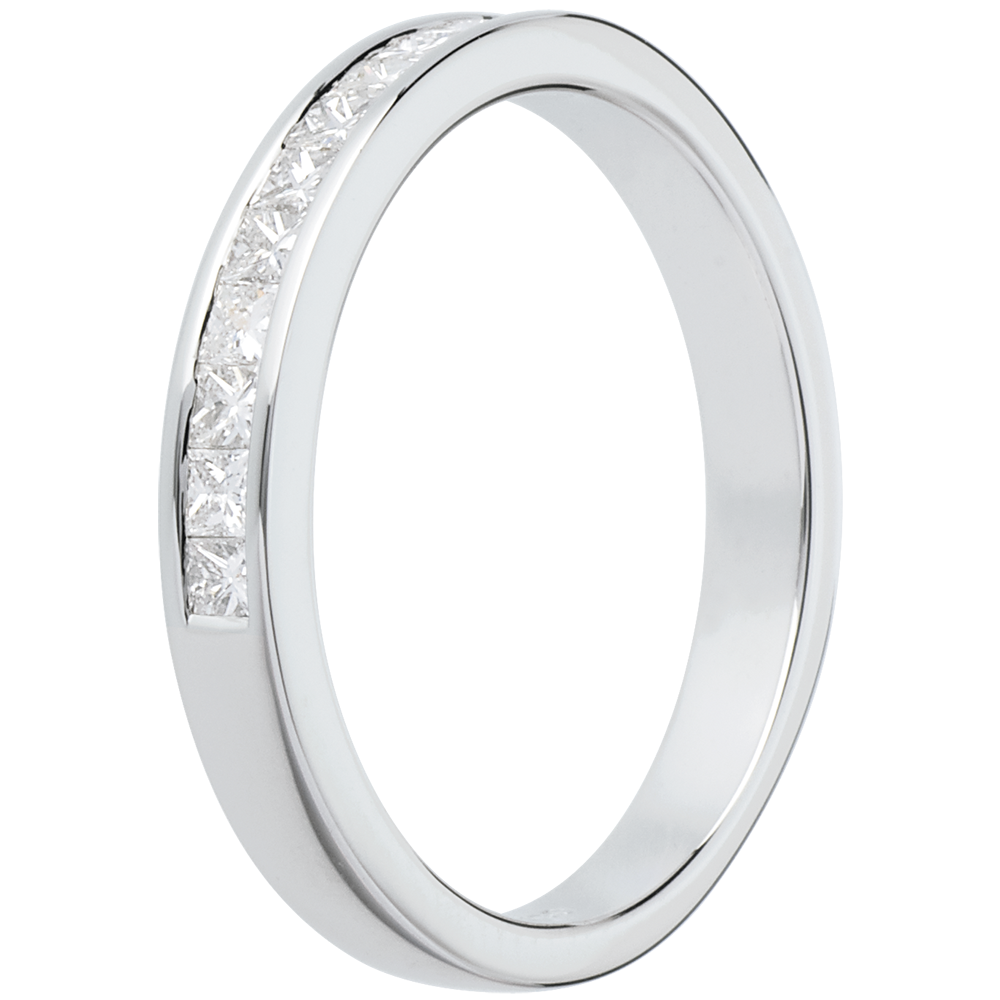 Un anneau de section carrée, au pavage semi circulaire. Diamants taille princesse sertis rail.