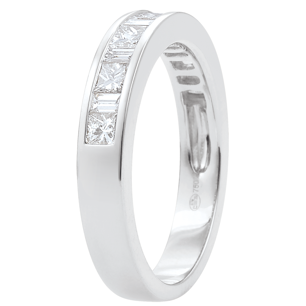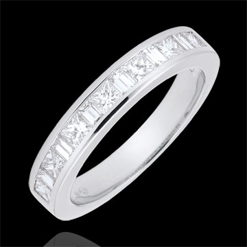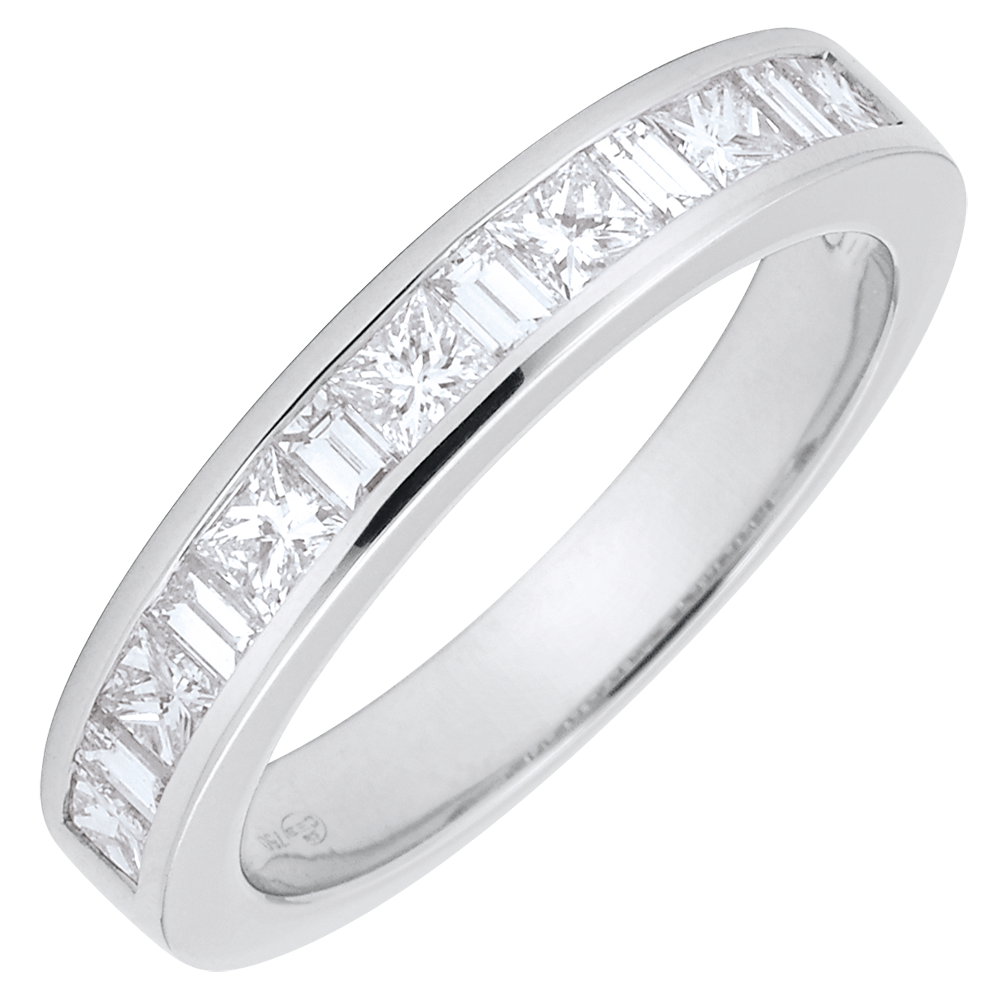 L'équilibre parfait d'un anneau or blanc avec diamants princesses et baguettes sertis rail, pour une symbolique forte. Un bijou incontournable pour un lien d'exception. 13 diamants : 0.7 carat - Or blanc (18 carats = 750/-): 3.8 g. Plus dimensions