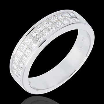 Un anneau de section carrée, au pavage semi circulaire. Diamants taille princesse sertis rail deux rangs.