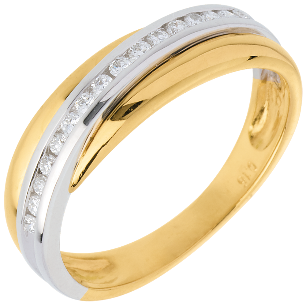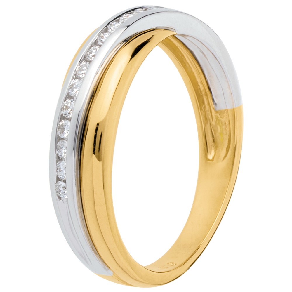 Une alliance or jaune enlacée d'un arceau or blanc pavé diamants - serti rail.