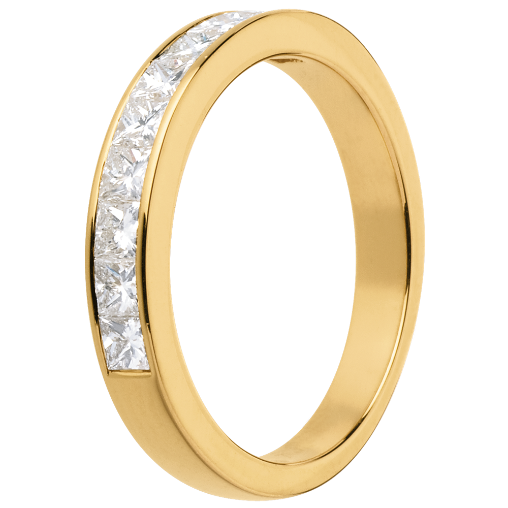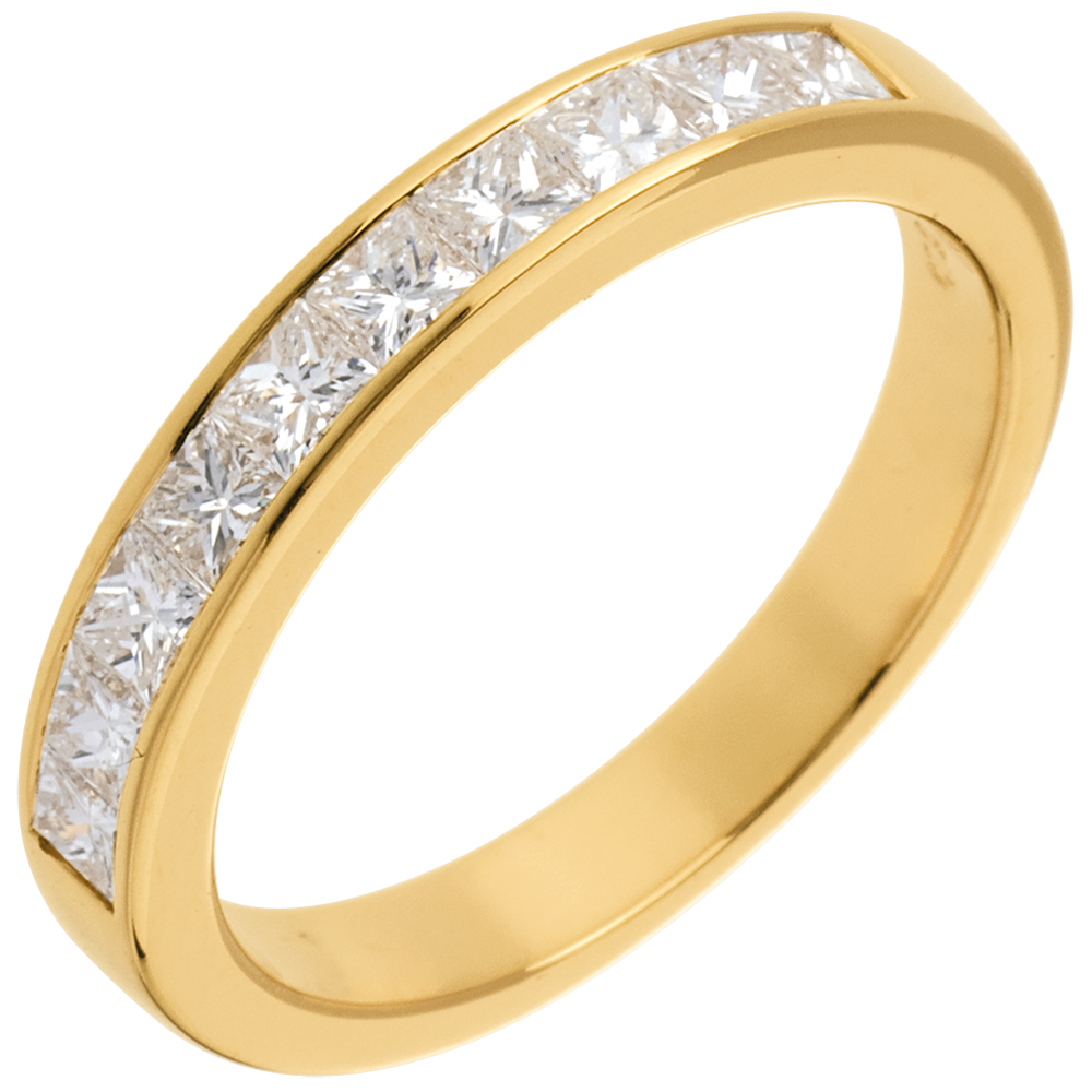 Un anneau de section carrée, au pavage semi circulaire. Diamants taille princesse sertis rail.