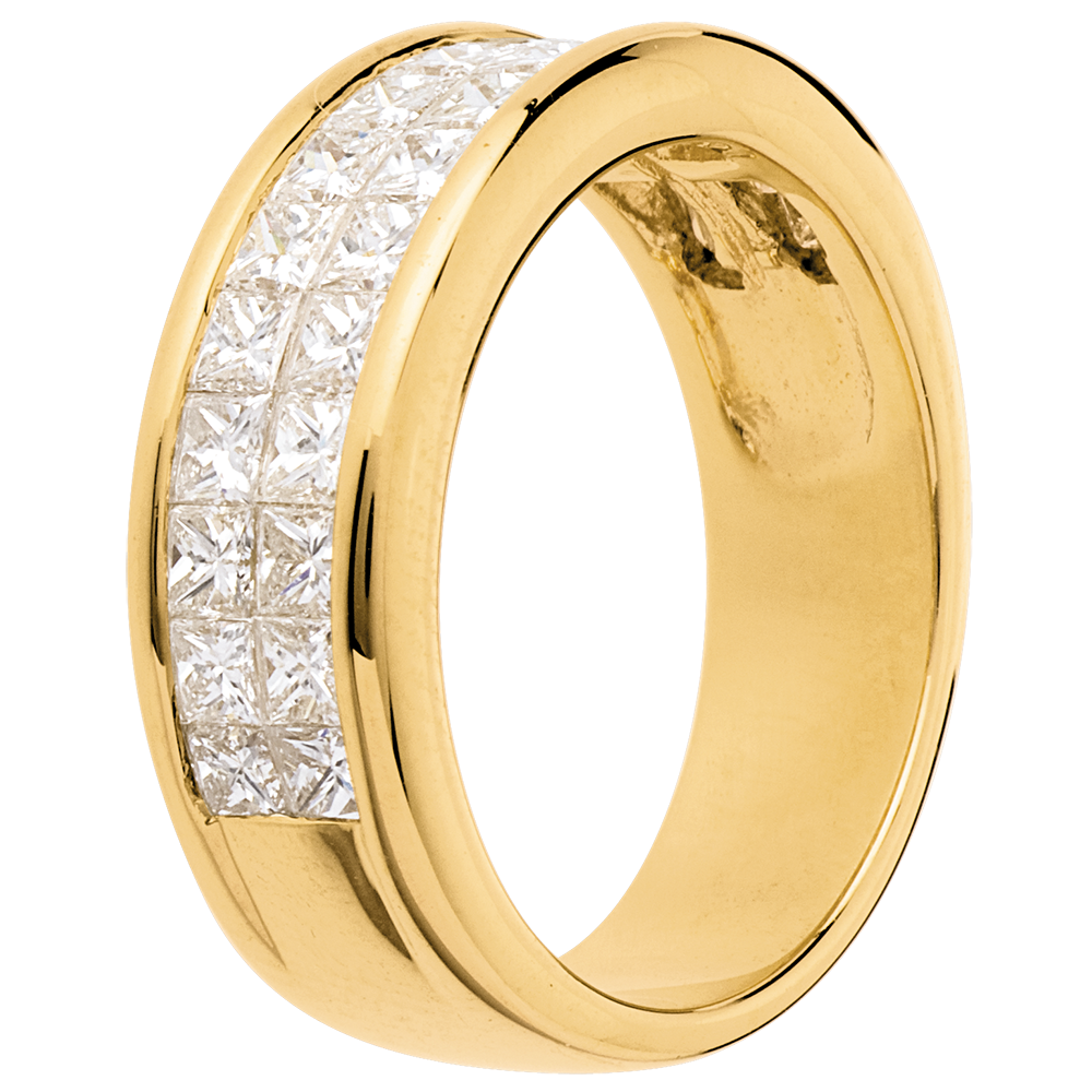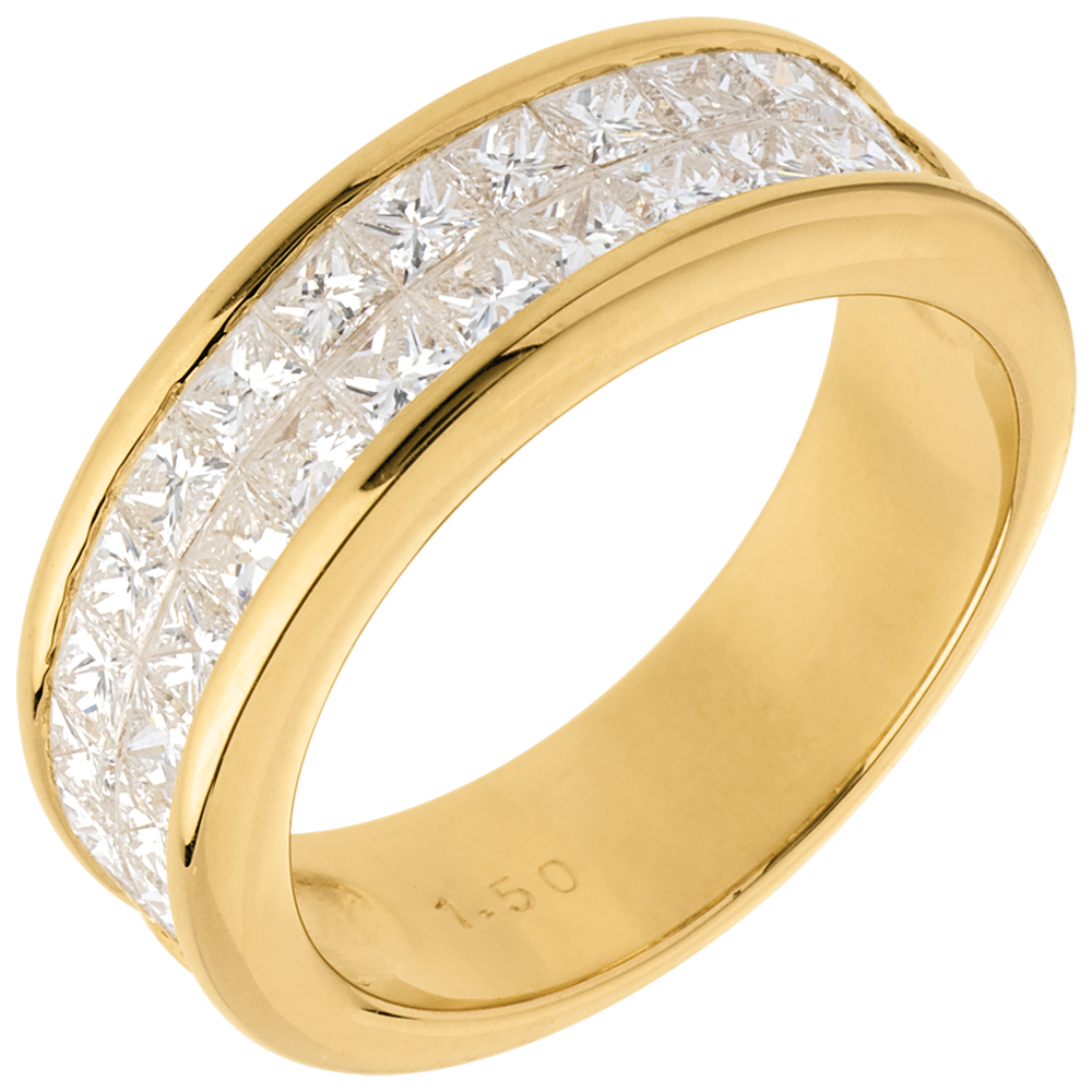 Un anneau de section carrée, au pavage semi circulaire. Diamants taille princesse sertis rail deux rangs.