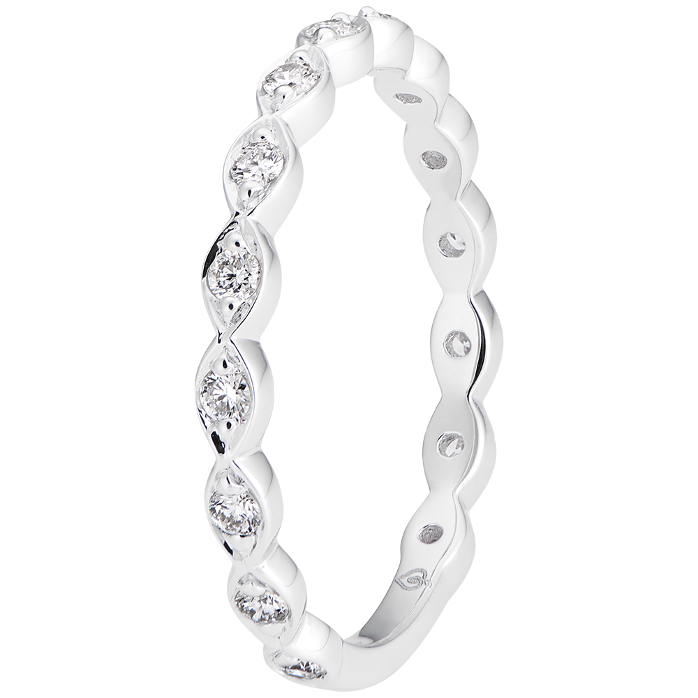 Un anneau composé d'une succession de pavages en amande pour une bague aux formes douces et rafinées.