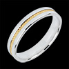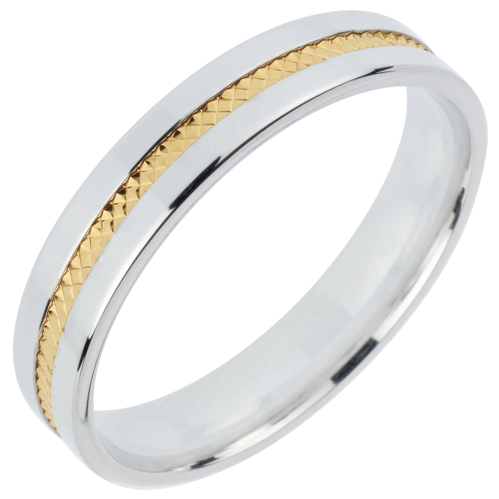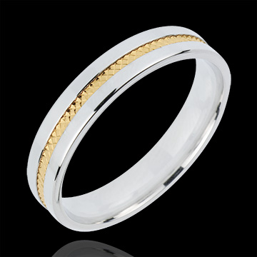 une alliance en or blanc avec un motif gravé en or jaune pour lui donner un maximum de brillance.