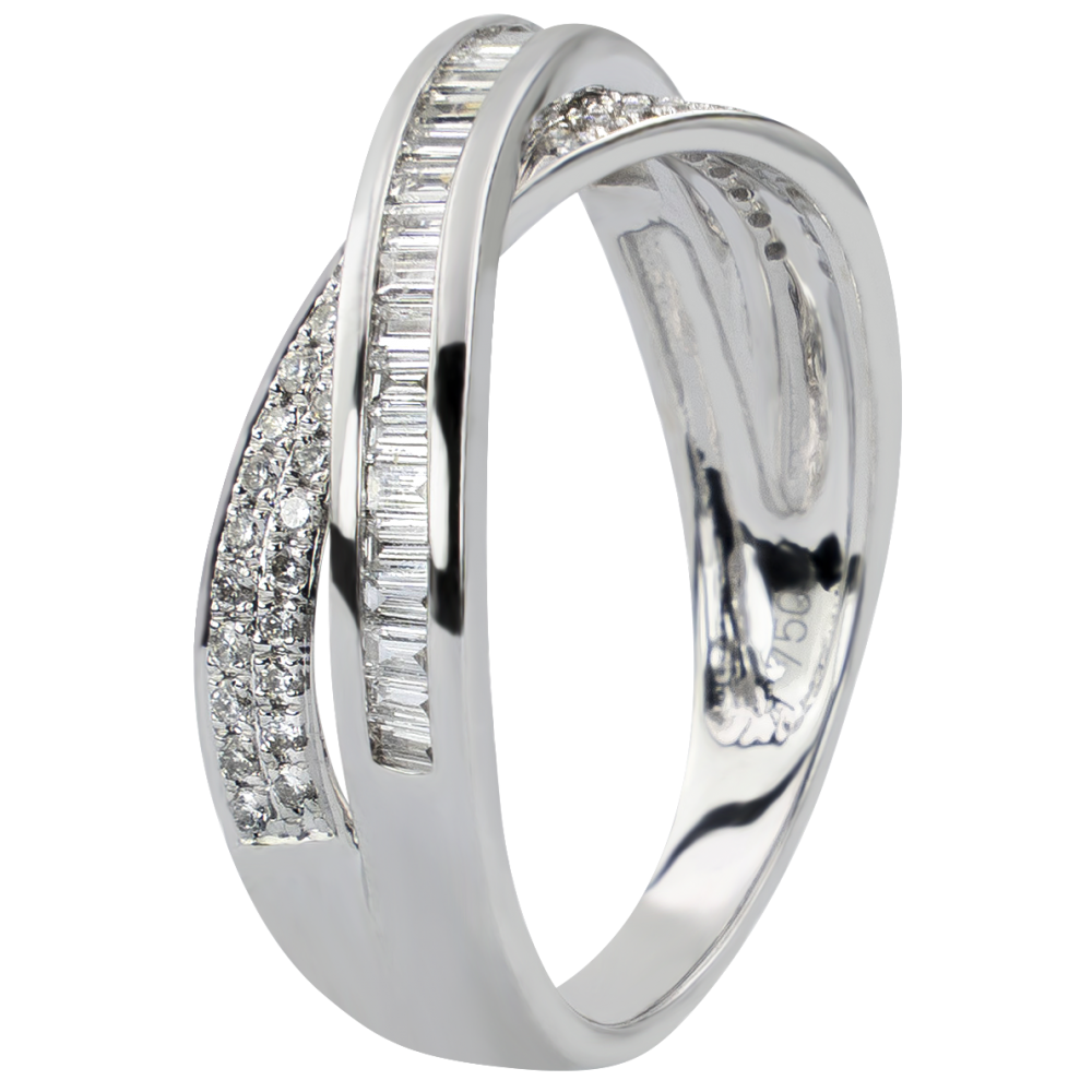 L'alliance équilibrée de 2 anneaux, souligné d'un pavage diamants brillant et diamants baguettes.