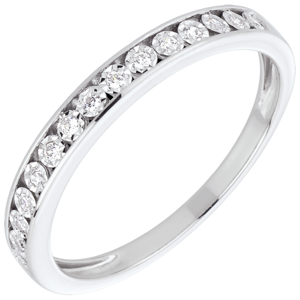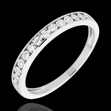 cette alliance a un serti d'or blanc autour de ses diamants qui emplifie la brillance du bijou dans son ensemble.
