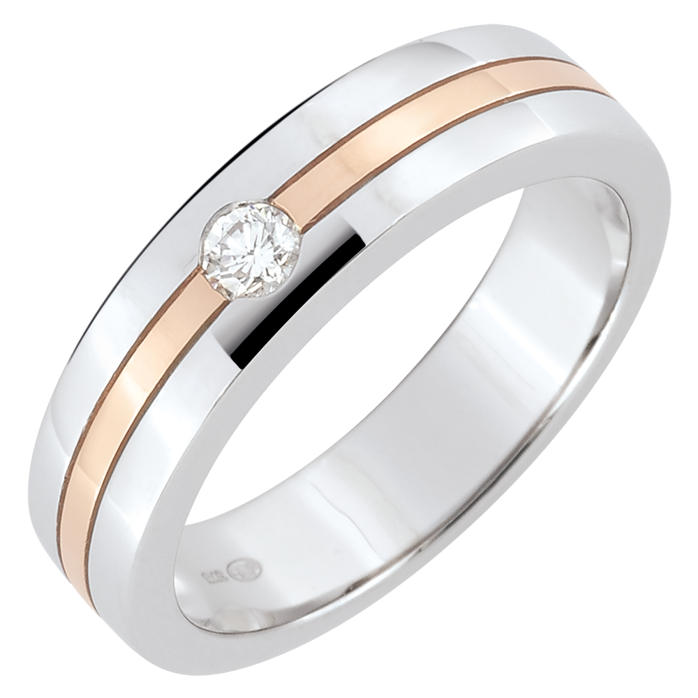 Cette alliance en or blanc est parée d'un diamant central et traversée par une bande en or rose pour un effet brillant et matte bimatière.