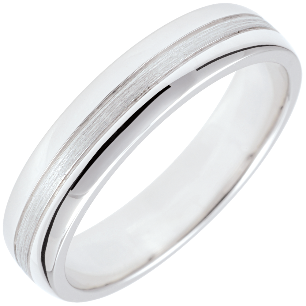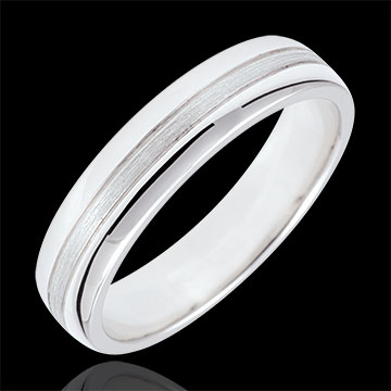 Un anneau en or blanc est traversé par une bande en or brossé pour un effet brillant et matte bimatière.