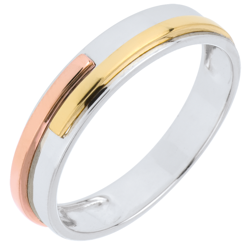 Un bandeau d'or blanc est cerclé par un ruban d'or jaune et rose. Une alliance trois ors moderne et unique.