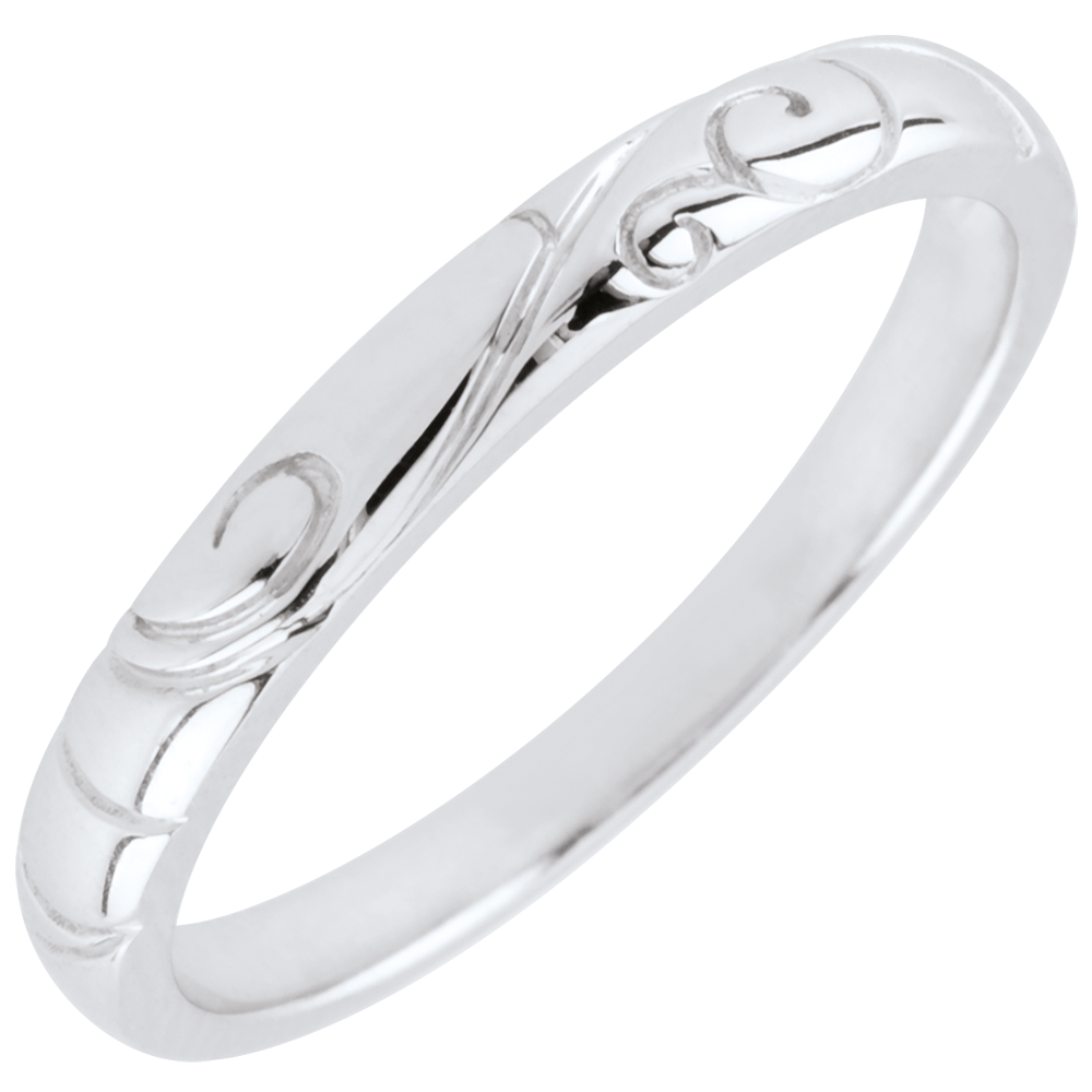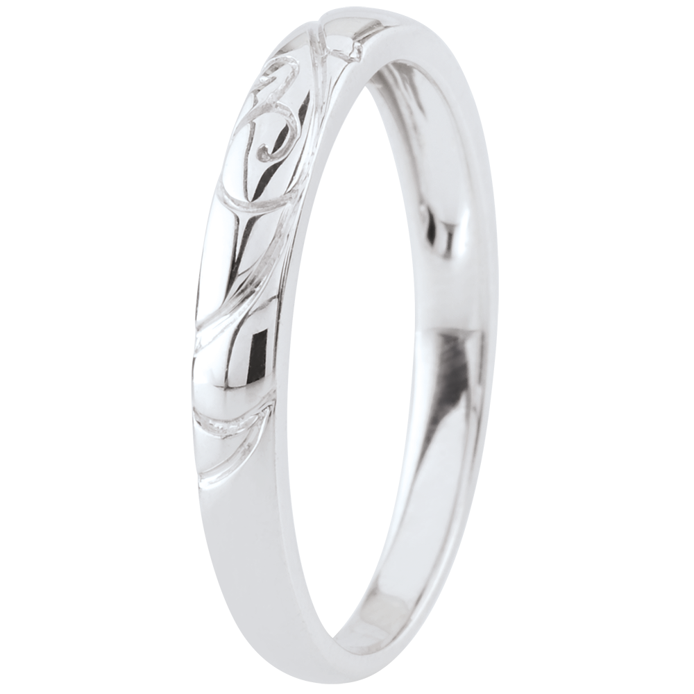 Découvrez l’alliance Triba, une création mixte en or blanc 9 carats, sublimée par des arabesques gravées délicates. Son design créatif évoque la finesse et l’élégance, parfait pour célébrer un engagement précieux.