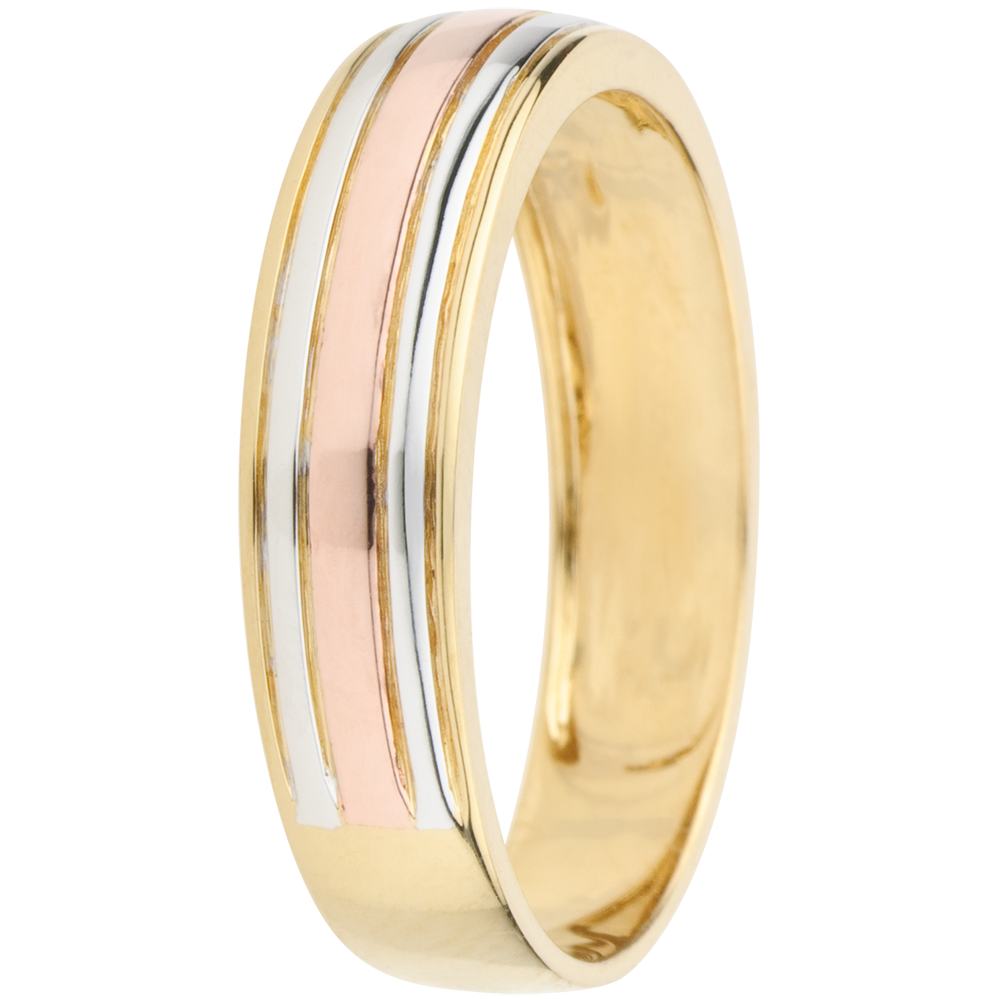 La finesse de tranches d'or empilées pour une alliance trois ors forte et raffinée.