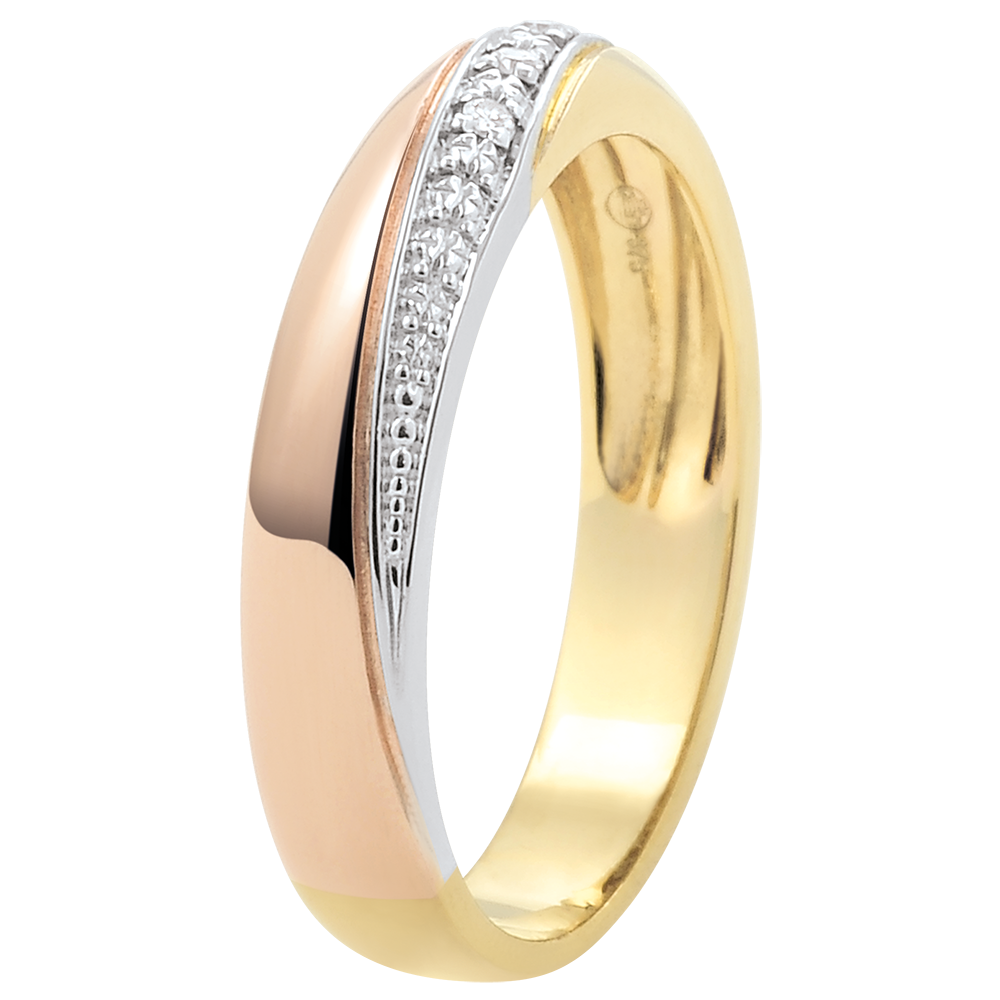 L'alliance équilibrée des trois couleurs d'or: blanc, jaune et rose, soulignée d'un pavage diamants pour une alliance unique et intemporelle.