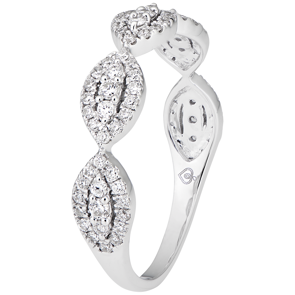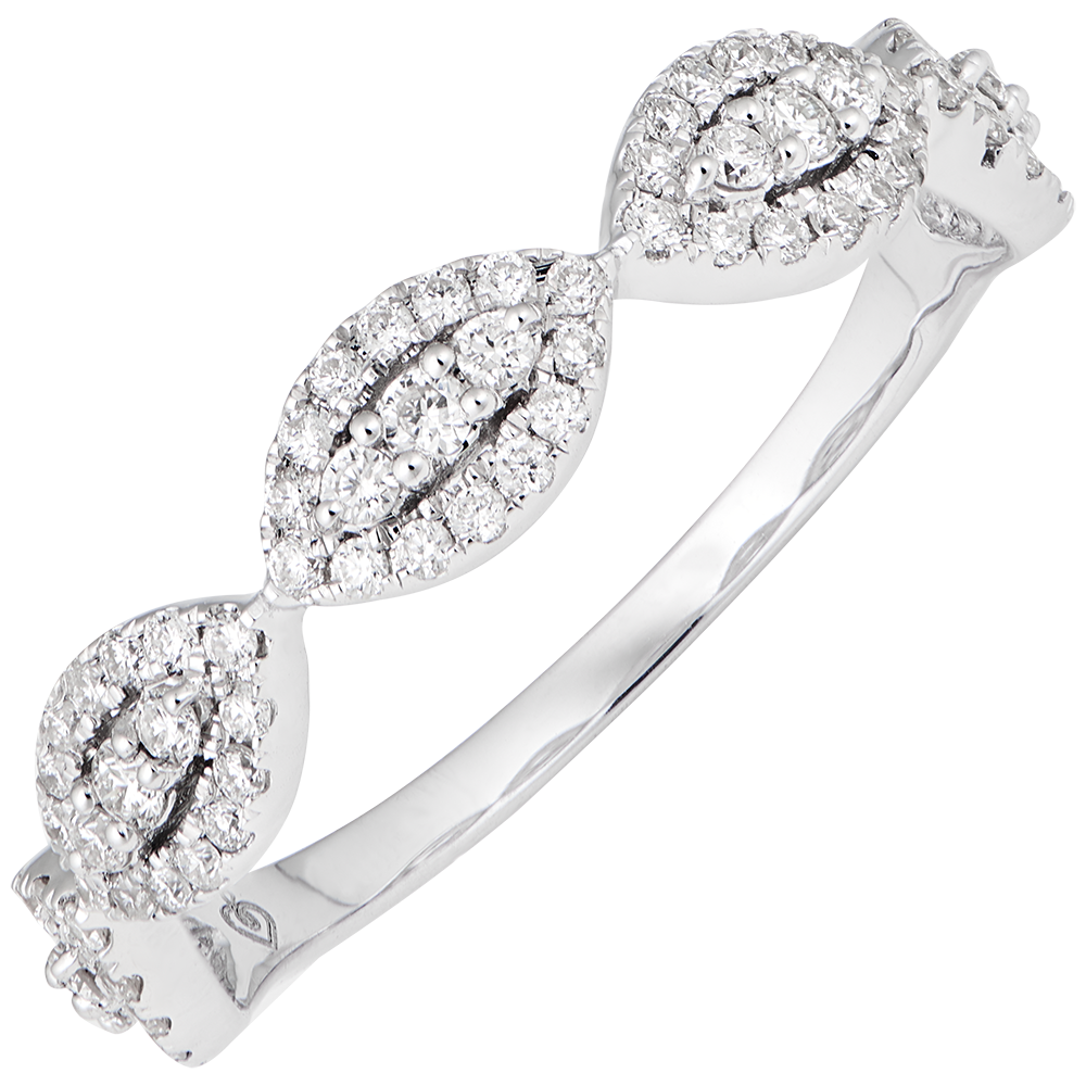 Un anneau composé d'un semi pavage en amande, pour une bague fine et créative, à porter en superposition ou comme alliance.