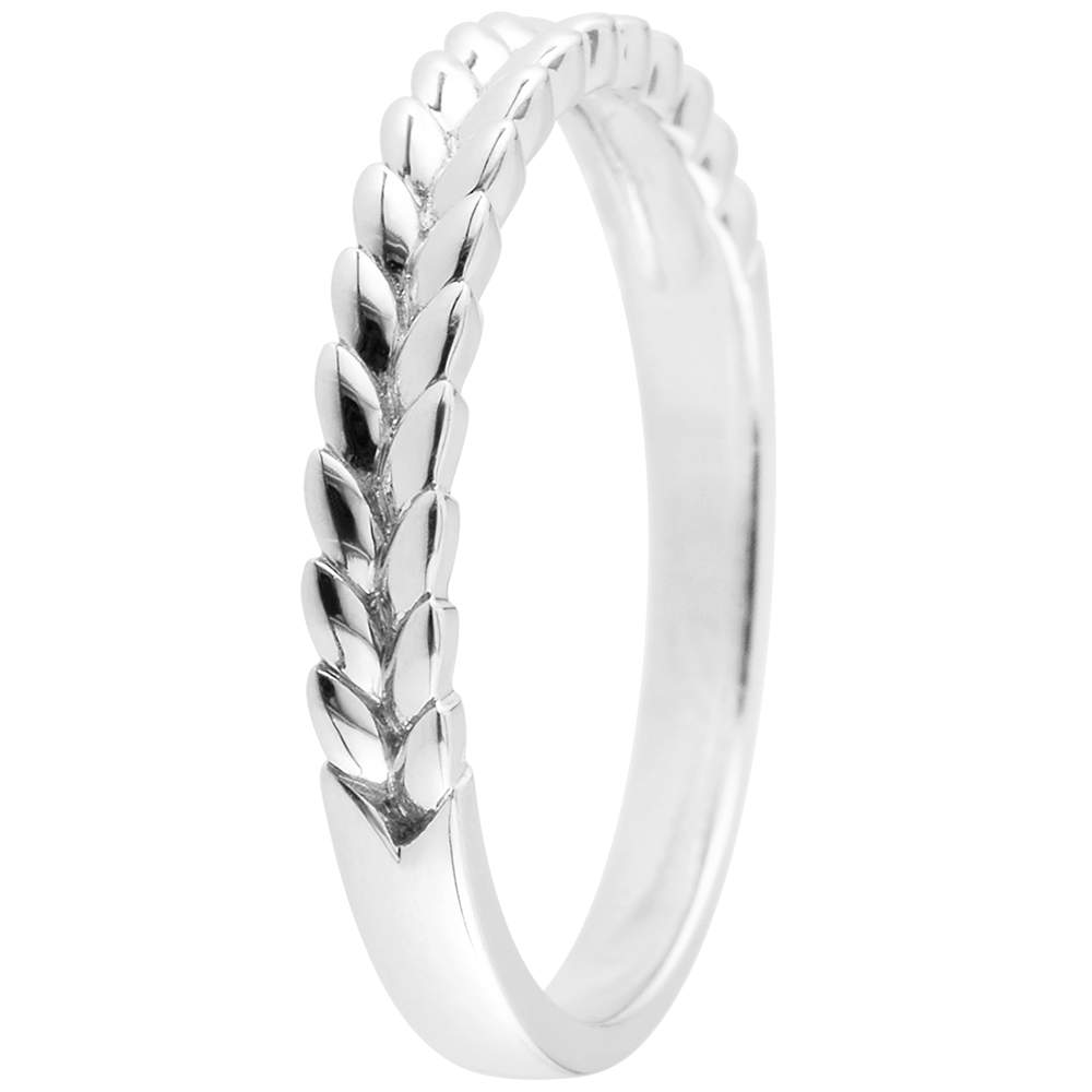 Un anneau composé de feuilles d'or tressées sur la moitié de la bague. Parfait pour une alliance originale et raffinée ou un anneau à combiner à d'autres bagues. Or blanc (9 carats = 375/1000): 1.9 g. Plus dimensions