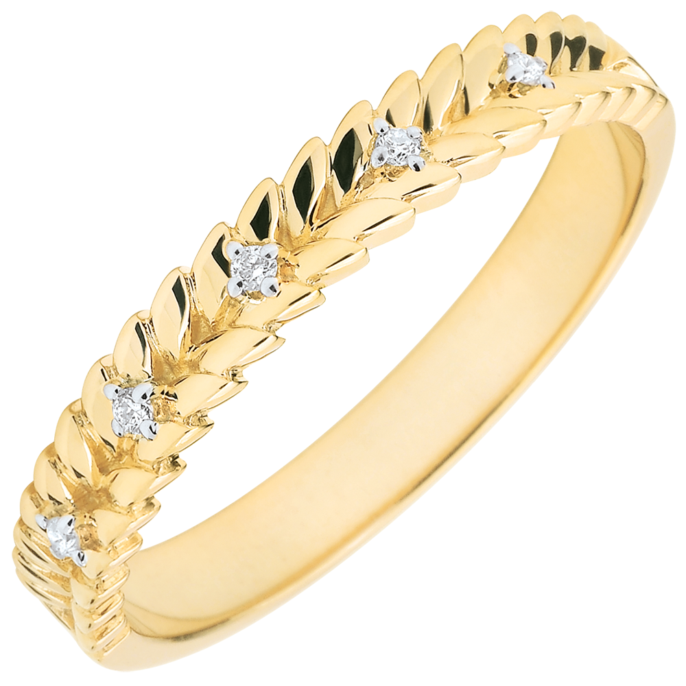 De délicats diamants se sont glissés dans le feuillage d'or tressé de cette anneau en or jaune. Ce bijou pourra être porté comme une bague ou une alliance romantique et raffinée. 5 diamants : 0.03 carat - Or jaune (18 carats = 750/-): 2.3 g. Plus dimensions