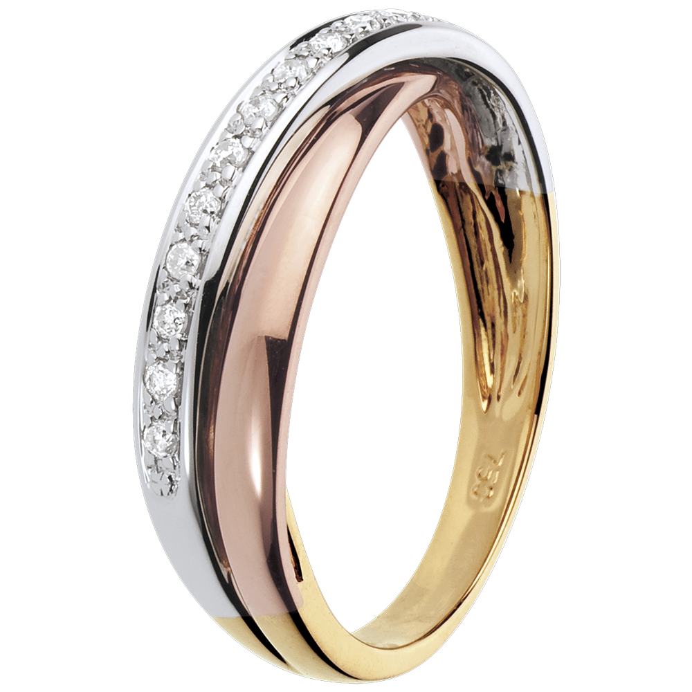 L'alliance équilibrée des trois ors soulignée d'un pavage diamants sur or blanc. Cette bague 3 ors et diamant est un bijou qui peut être une alliance de mariage ou un cadeau d'exception. 13 diamants : 0.1 carat - Trois ors (18 carats = 750/-): 3.5 g.Plus dimensions