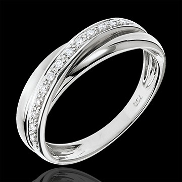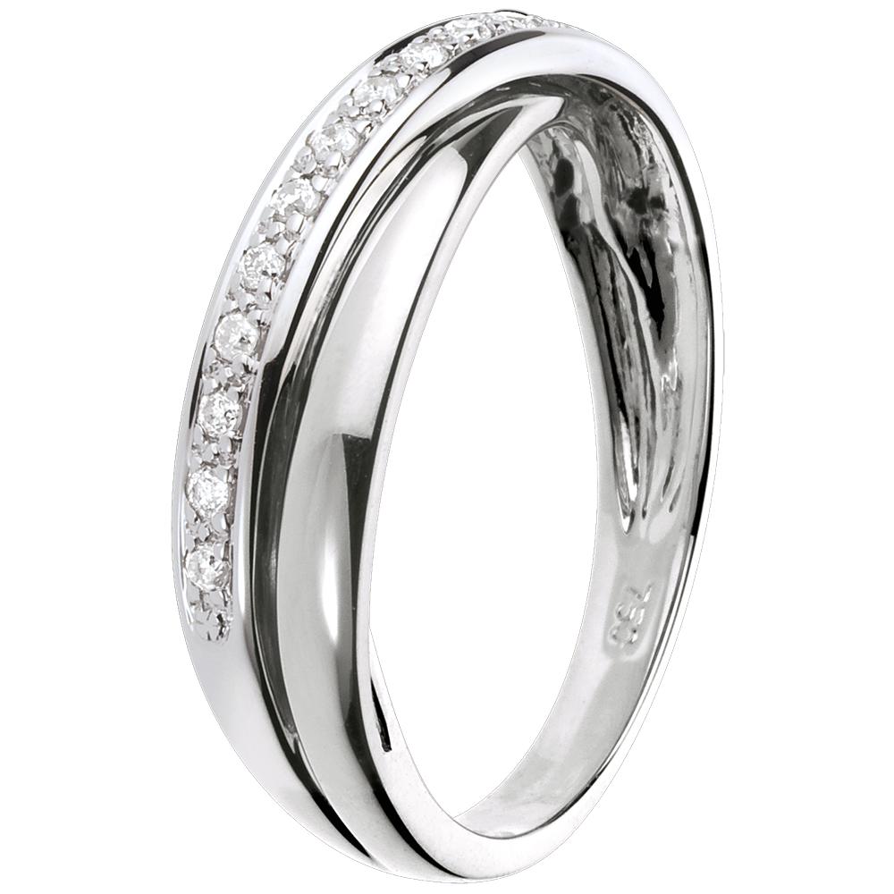 L'alliance équilibrée de 3 anneaux, soulignée d'un pavage diamants sur or blanc crée une bague exceptionnelle. Cette bague en or blanc et diamant est un bijou qui peut être une alliance de mariage ou un cadeau d'exception. 13 diamants : 0.1 carat - Or blanc (18 carats = 750/-): 3.9 g. Plus dimensions