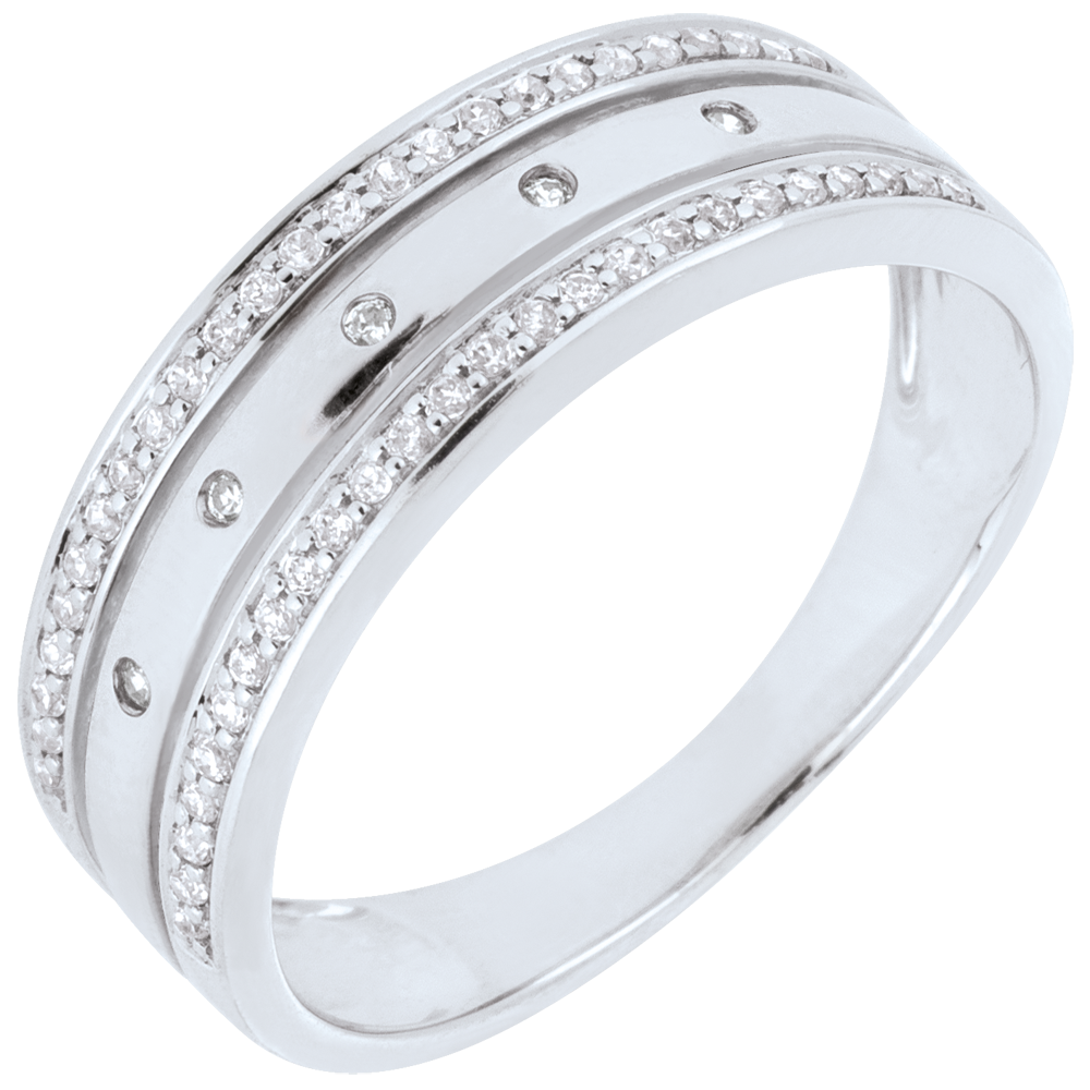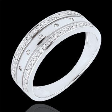 Deux anneaux d'or blanc pavés de brillants encadrent un anneau d'or central habillé de cinq diamants.