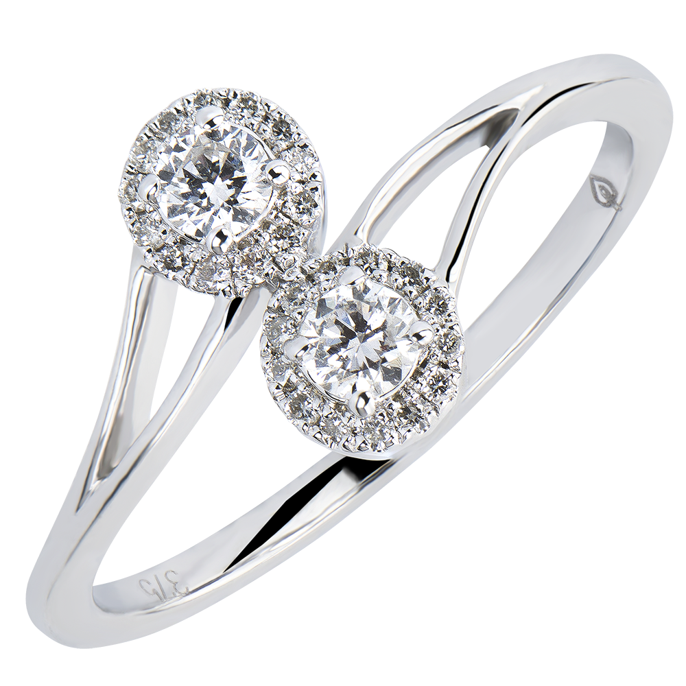 La reflexion symetrique de deux diamants ronds, pavés d'un halo diamant, pour une bague symbolique et féminine.