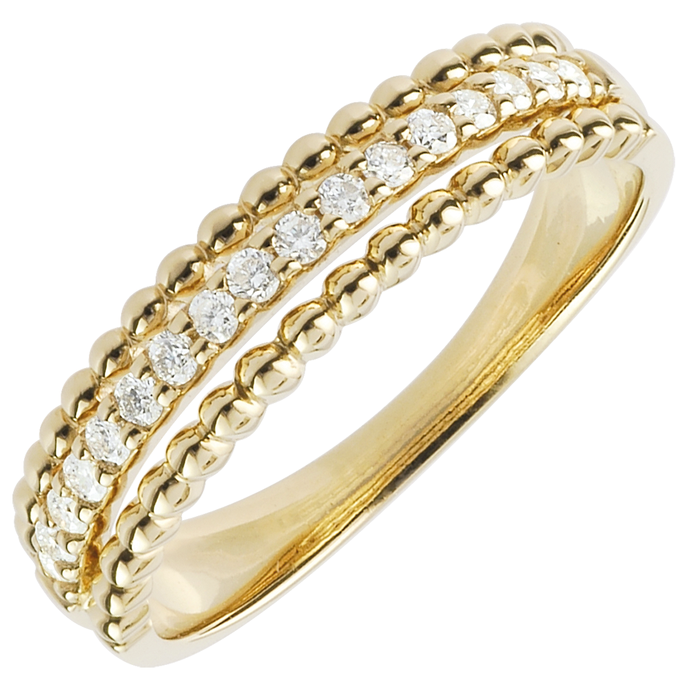 Deux rangées de perles d'or encadrent un anneau de diamants surelevé. Pour une alliance hors du commun ou une bague qui combine raffiné et élégance. 17 diamants : 0.19 carat - Or jaune (9 carats = 375/1000): 2.5 g. Plus dimensions