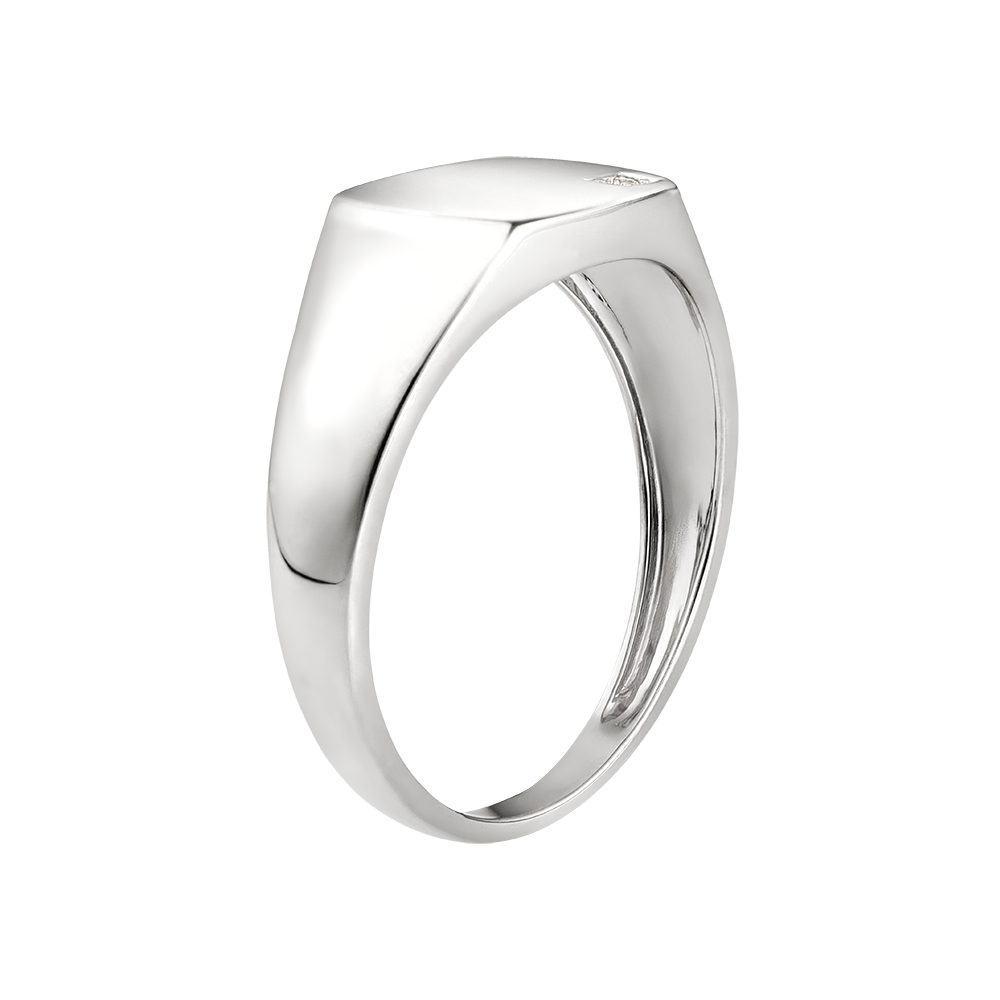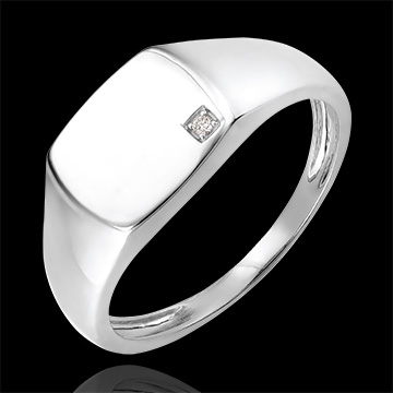 Une chevalière en or blanc, dont le plateau tonneau est serti d'un diamant étincelant.