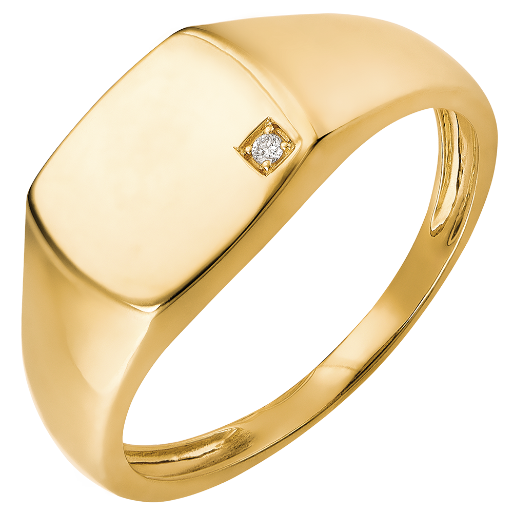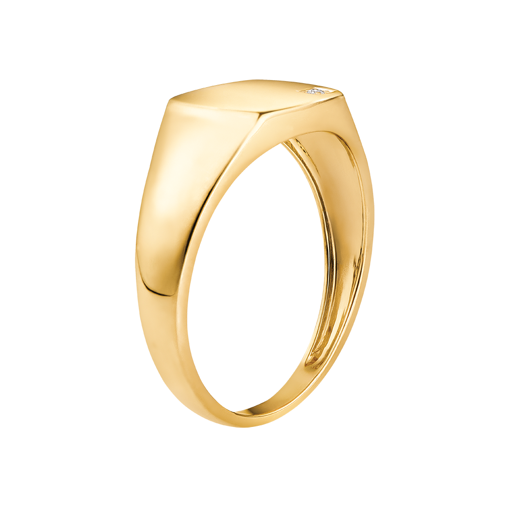 Une chevalière en or jaune, dont le plateau tonneau est serti d'un diamant étincelant.